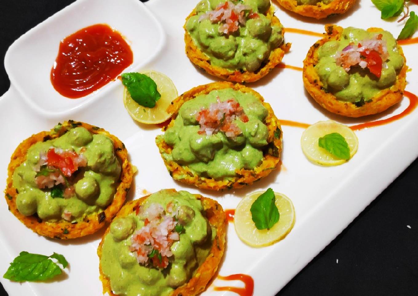 - Now fill each canapy with the chole filling. Tasty cheesy banana canapies ready to dig in. Garnish with tomatoe onion salad. Drizzle with few drops of lemon juice.Serve with some tomatoe sauce.Enjoy.