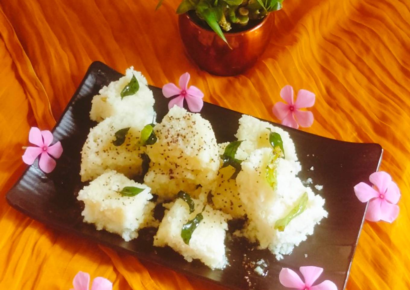 - Saute for a while and once the tempering splutters spread the tempering over dhokla.