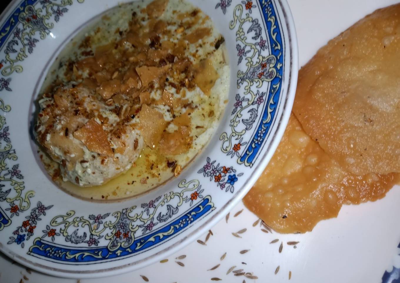 - For Bhagar: in a silver little pot add oil or heat then add cumin seeds and carom seeds and pour it on dahi Baray,