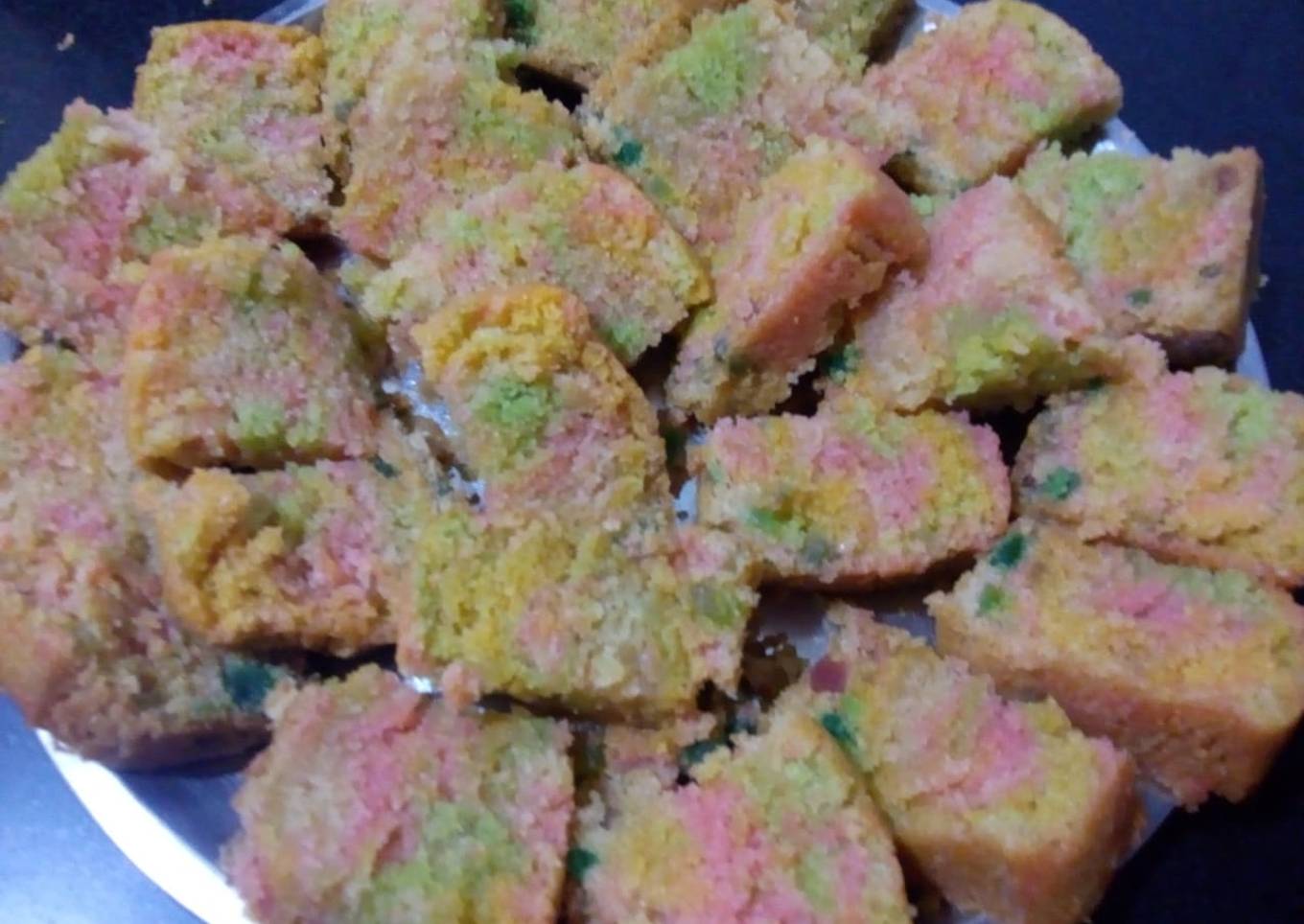 - Pour the colour one by one on a greased tin add the colour in the centre so that the prevent colour spread out now bake the cake preheated cooker at medium flame for 40-50 minutes when the cake is baked completely (poke the cake with a toothpick it will come out clean)remove it and cool down completely slice and serve
