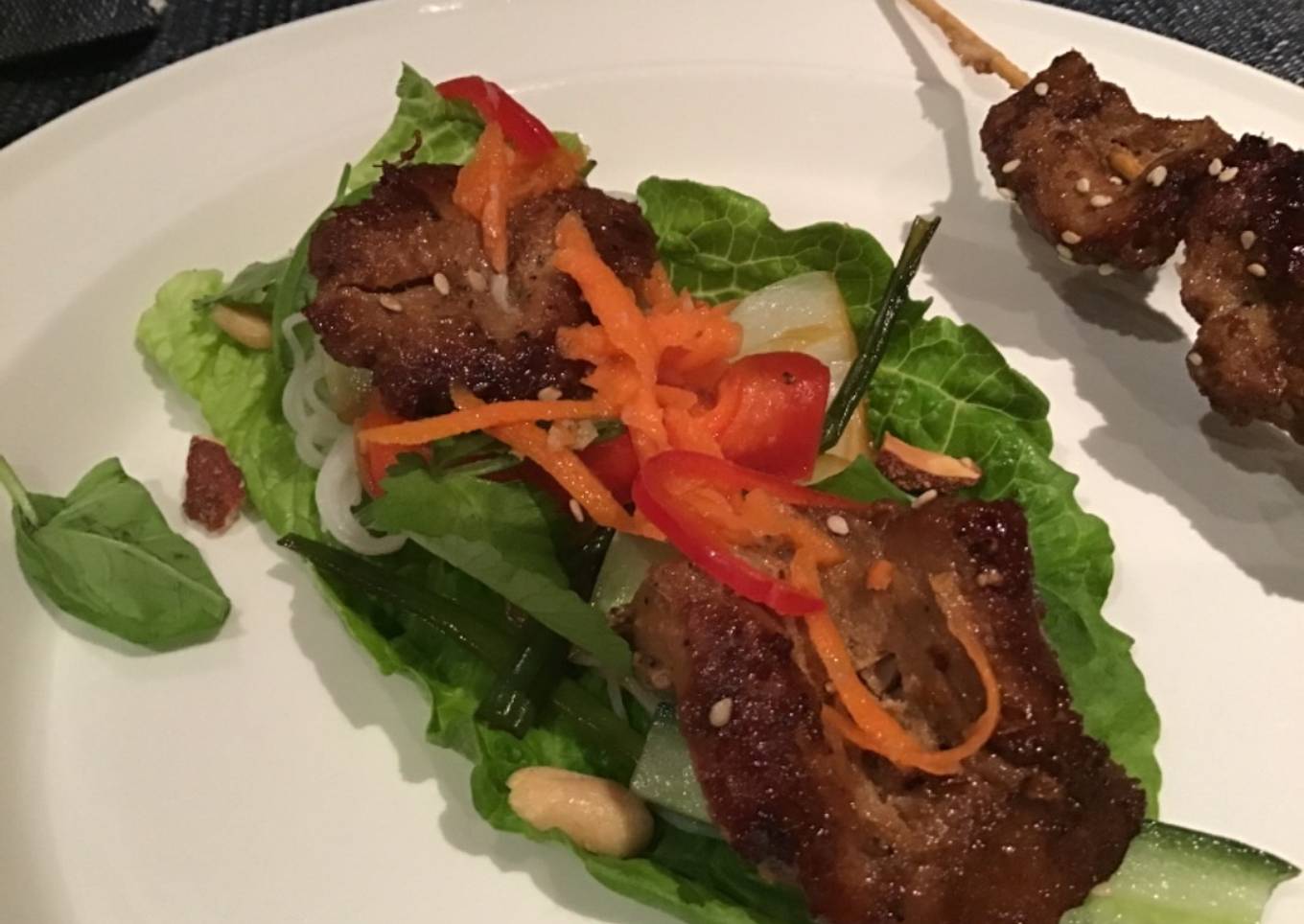 - Top each lettuce leaf with the pork, noodles, cucumber, herbs and dipping sauce and a sprinkling of peanuts. Roll up as best you can and enjoy.